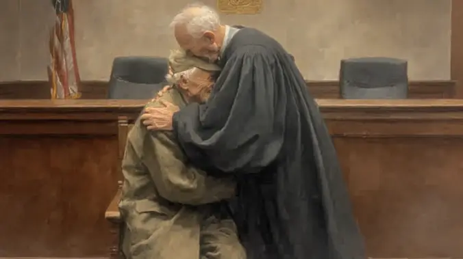 O juiz então fez algo que ninguém nunca tinha visto. Ele desceu do banco alto, caminhou diretamente até a cadeira de rodas e puxou o velho soldado para um abraço forte e completo.